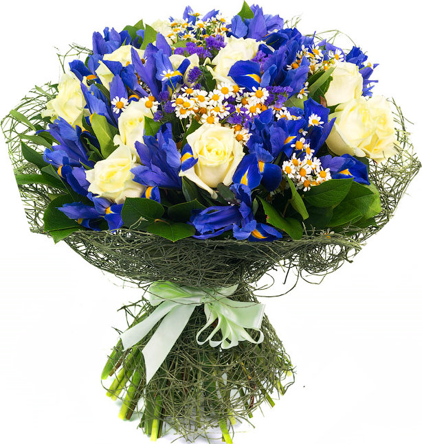 Чудесный букет из великолепных синих ирисов, нежнейших белых роз и трепетных ромашек - это замечательный и душевный подарок, который окутает вас своим благоуханием, подарит радость и чувственность, раскроет душевную теплоту и нежность.